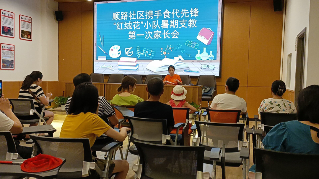 在家长会上介绍了本次支教活动的时间:从7月11日正式开始,7月30日结束;同时也详细介绍活动服务的内容和注意事项等,以暑假班为单位通过线下教学和线上微信群相结合的形式,开展辅导员工的作业、手工书法、趣味知识科普(食品知识、红色饮食文化)等其他教学服务,为员工们提供一个优质的学习环境,为社区的基础教育贡献一部分力量;在会议现场也强调本次活动安全的相关事宜,并向家长承诺会细心照顾好每一位儿童,各位家长也在安全责任书上郑重的签下自己的名字;在会议最后为参会人员实时解答疑惑与完成登记信息,做到公开透明。顺路社区曾婷与穆家社区的教师也表示对本次支教活动的大力支持与高度的期待。